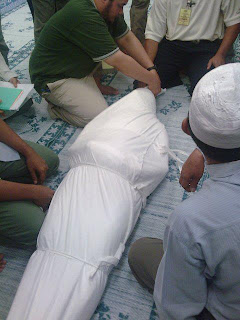 – Semestinya jenazah diletakkan dengan posisi agak miring menghadap ke arah Barat Laut, sebagaimana arah kiblat bagi orang Indonesia ketika sholat, bukan persis ke arah Barat.