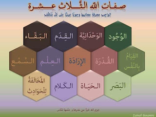 12. kalam: Allah berkalam/berfirman tanpa lidah dan dua buah bibir. Kalam/firman Allah bukan berupa bahasa Arab atau bahasa lainnya, karena Allah yang menciptakan bahasa, huruf, dan suara. dan Kalam-Nya tidak sama dengan kalam/omongan kita.